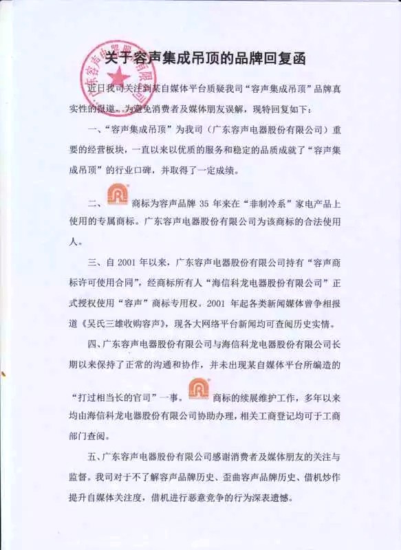 2015年6月17日,某微信公眾號(hào)刊發(fā)未署名帖子,惡意詆毀容聲集成吊頂。對(duì)于此文,廣東容聲電器股份有限公司已正式起函追究其發(fā)布者以及惡意傳播者的法律責(zé)任。