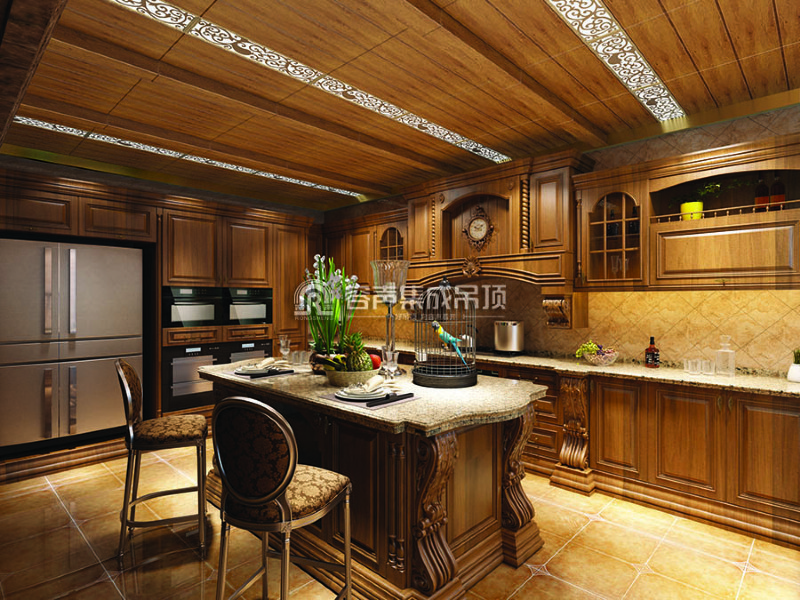 面板細線條紋與偌大回字造型LED燈組合在一起,如凝聚了空間的生命力,行程強有力的視覺焦點;簡歐原木打造的廚房家具使整個廚房空間形成不拘一格的布局,悠然從容。
