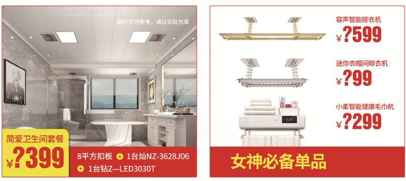 簡(jiǎn)愛(ài)衛(wèi)生間套餐,8平方扣板適配智暖家浴室暖霸,雙域取暖,正負(fù)離子殺菌技術(shù),搭配手機(jī)APP智能控制,讓科技前沿走進(jìn)我家。