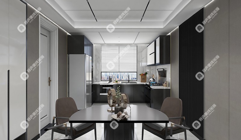 餐廳和廚房一體,款色搭配依然以簡(jiǎn)約的黑白灰為主,干凈清爽,易于打理。