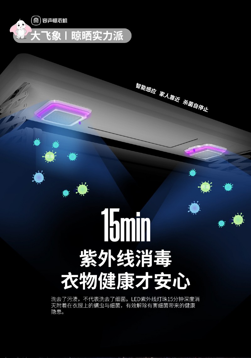 除此之外,高配款大飛象還配備烘干、照明、智能升降等超多實(shí)用功能,晾曬實(shí)力強(qiáng),無(wú)懼陰雨天,省下一臺(tái)陽(yáng)臺(tái)照明,夜間晾曬也更方便啦!