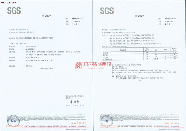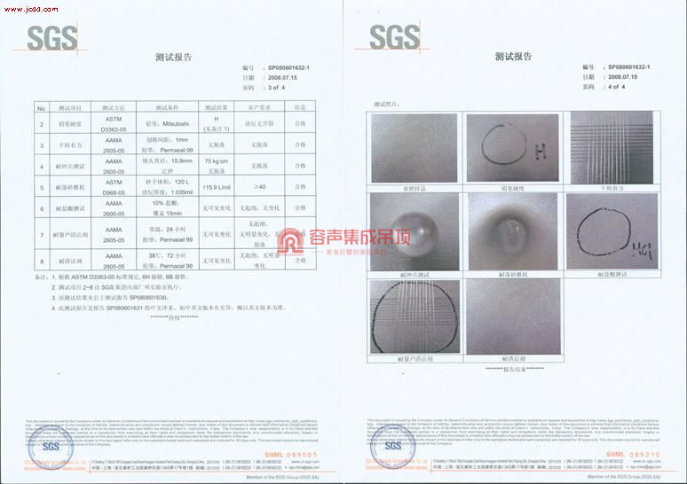 容聲集成吊頂所進(jìn)行的SGS認(rèn)證中,針對(duì)扣板的環(huán)保性能、硬度、干附著力、耐沖擊性、耐磨耗性、耐酸性、耐清潔劑性等方面進(jìn)行檢測(cè),全部達(dá)到認(rèn)證標(biāo)準(zhǔn)。